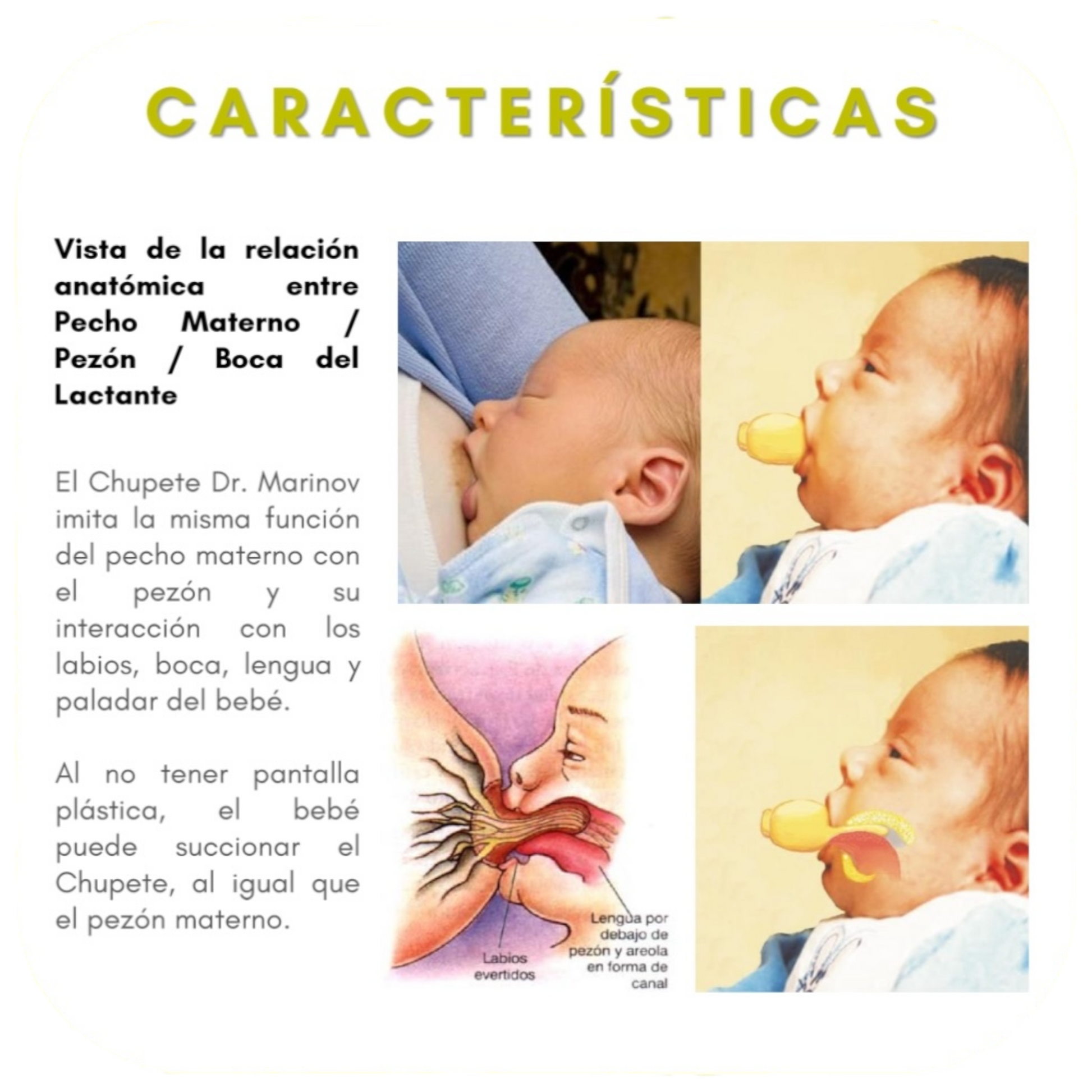 El chupete de Dr. Marinov está diseñado para imitar el pezón materno con su forma simple y textura blanda, ofreciendo una experiencia natural y cómoda para el bebé. Su diseño uniforme y suave facilita la aceptación, siendo ideal para recién nacidos. Este chupete es menos invasivo, ayudando a calmar y satisfacer al bebé de manera segura y natural desde los primeros días.